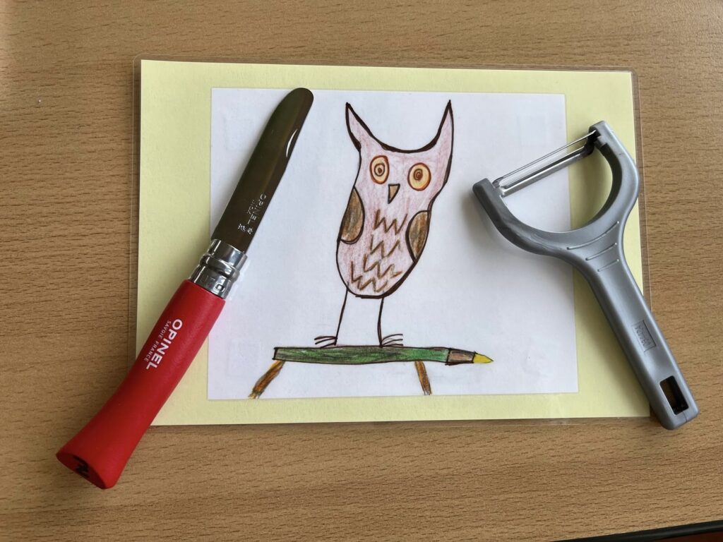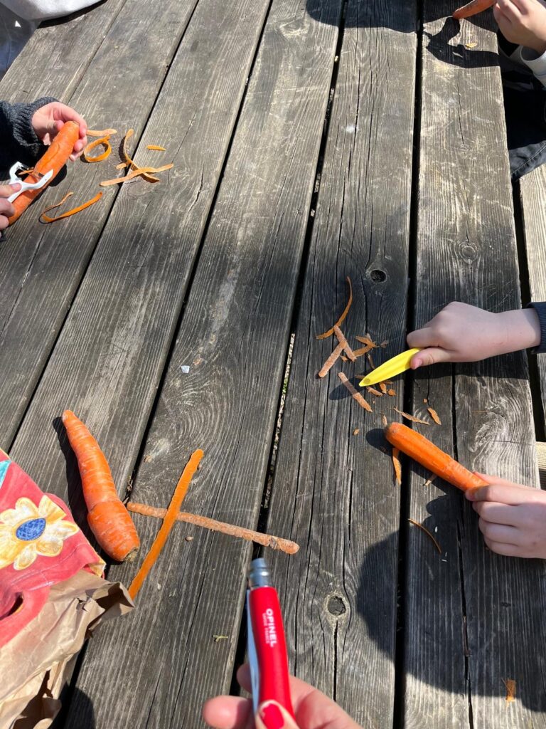 Wir starten das Schnitzprojekt. Als erstes wird mit dem Gemüseschäler geübt, dann geht es mit Kinder-Schnitzmessern weiter.