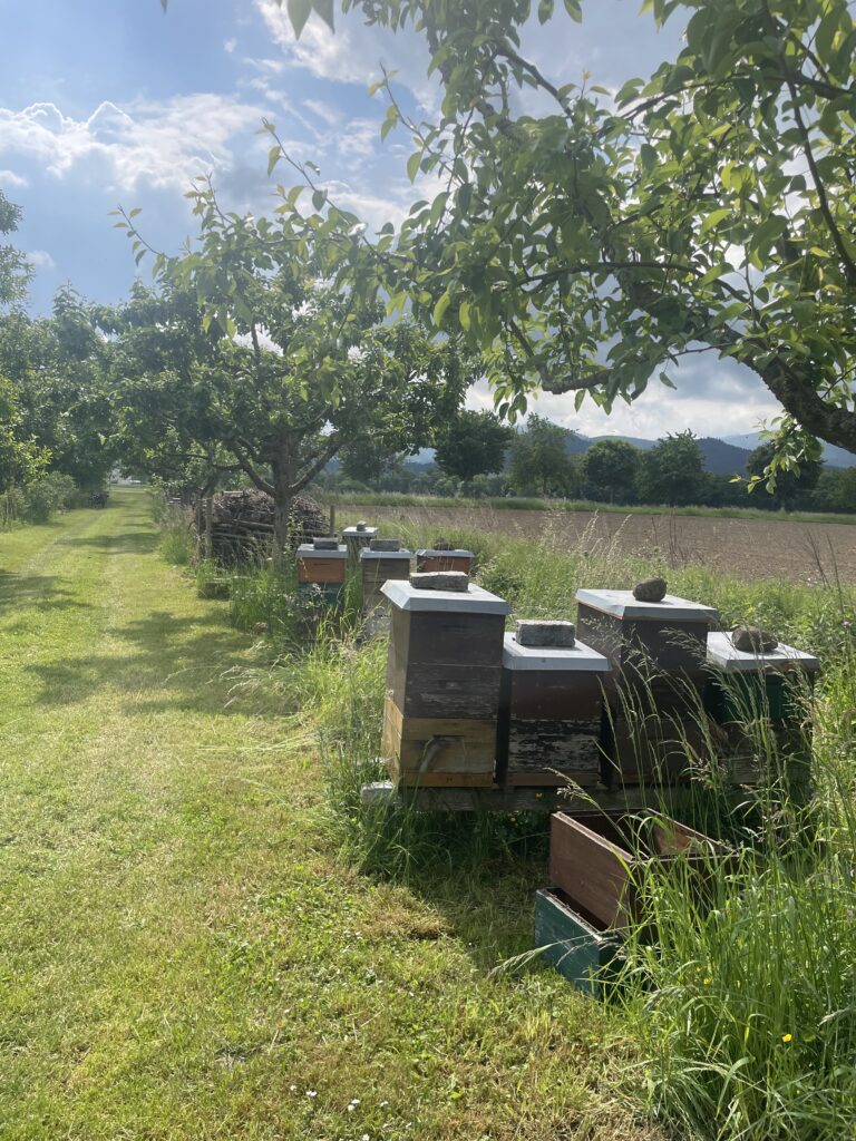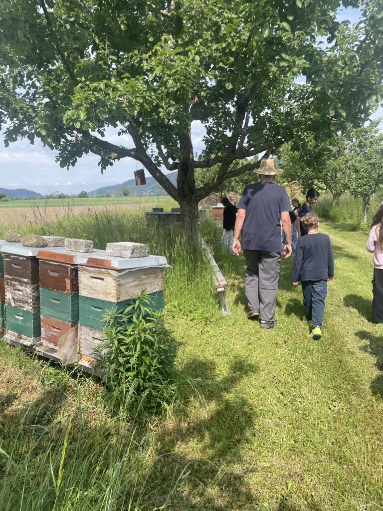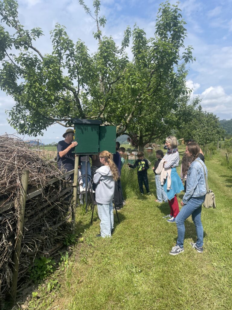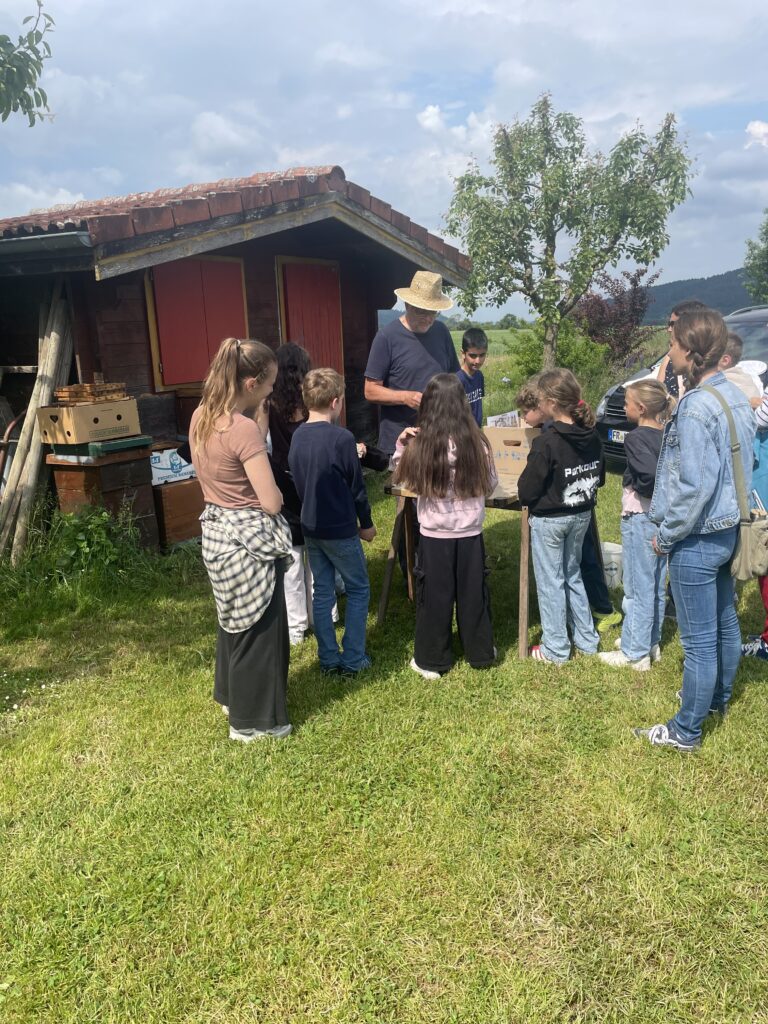 Innerhalb des unterrichtlichen Handlungsfeldes „Wildbienen“ stand heute der Besuch beim „schuleigenen“ Imker an. In seinem Garten führte er uns durch die Welt der Honigbiene.